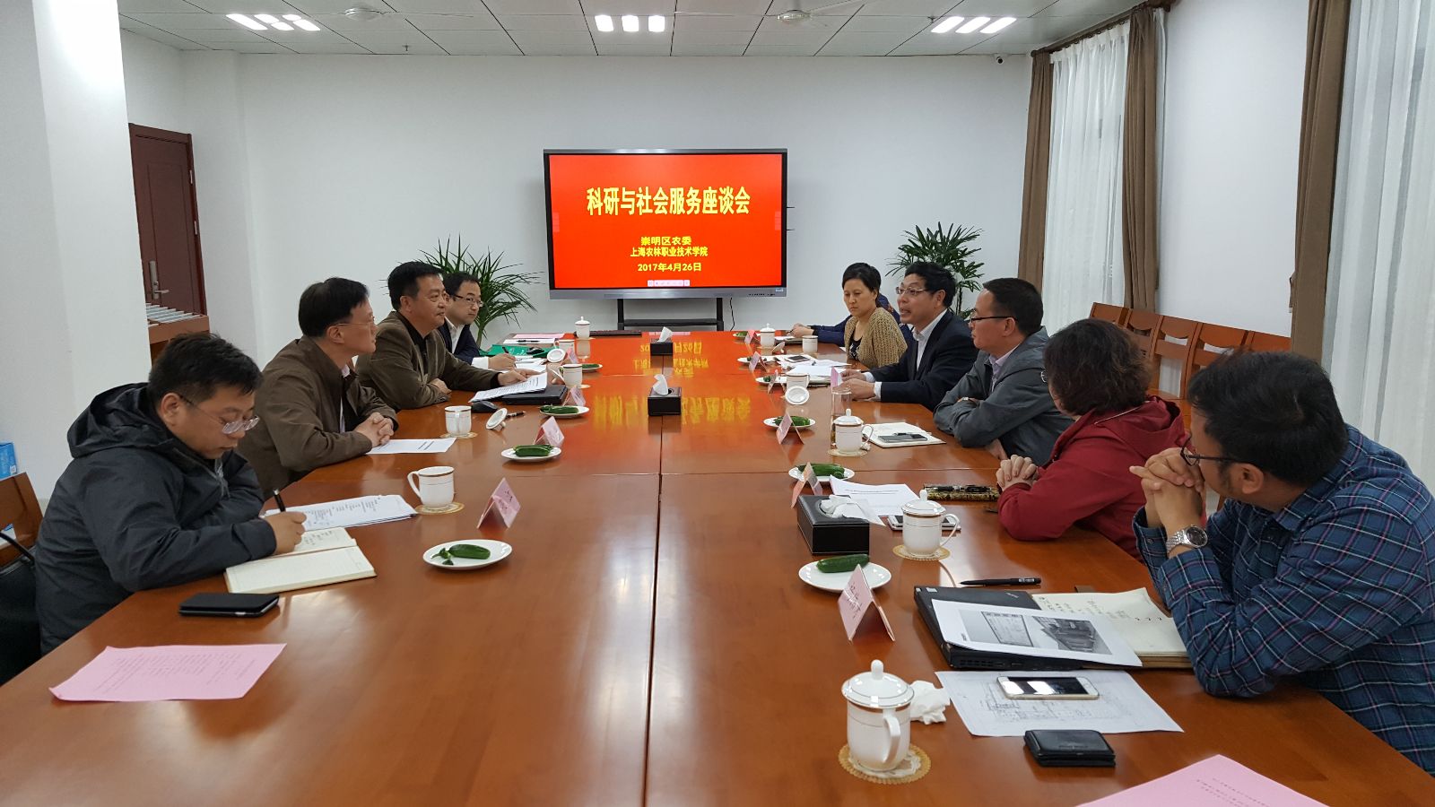 4月26日下午,学院在实训基地会议室召开科研与社会服务座谈会。崇明区农委副主任陆锦辉、崇明生态科创中心主任高益等一行6人应邀参加座谈,魏华院长出席会议,科研处及农生系负责人参加座谈。双方就科研项目合作和服务崇明生态岛建设等相关事宜展开充分讨论。座谈会由谢锦平副院长主持。