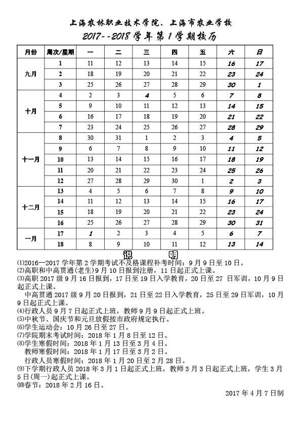 2017--2018学年第一学期校历