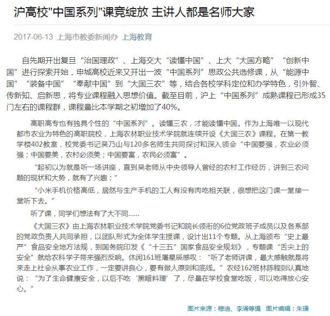 今日,继上观新闻、解放日报之后,上海教育更是用头条的形式报道了我院《大国三农》课程开讲情况,市教委对我院“中国系列”课程给予高度肯定。《大国三农》影响力正逐渐扩大,这是在学院党政班子领导下,各部门齐心协作、努力奋斗的成果和回报。