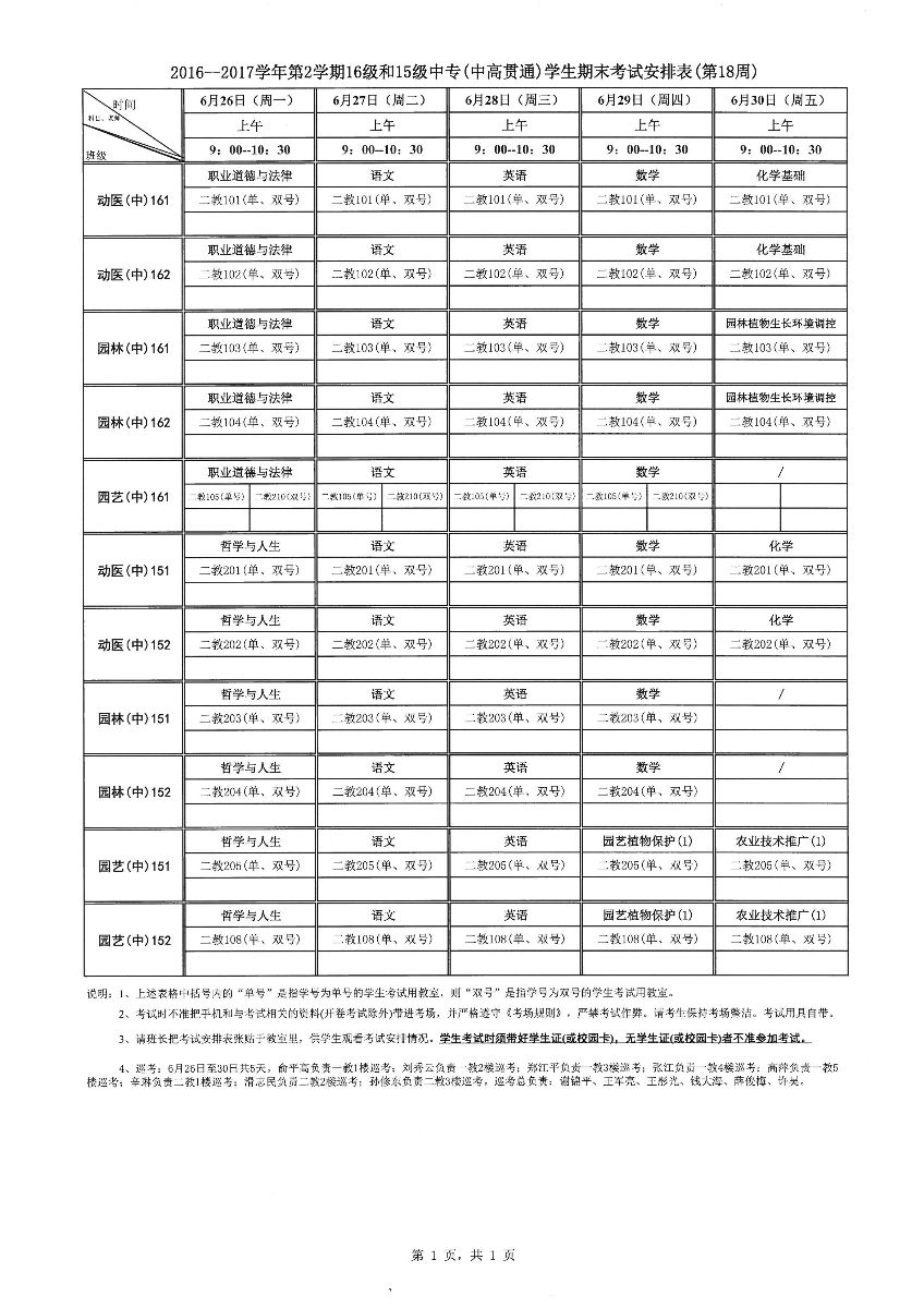 2016--2017学年第2学期16级和15级中专(中高贯通)学生期末考试安排表(第18周)