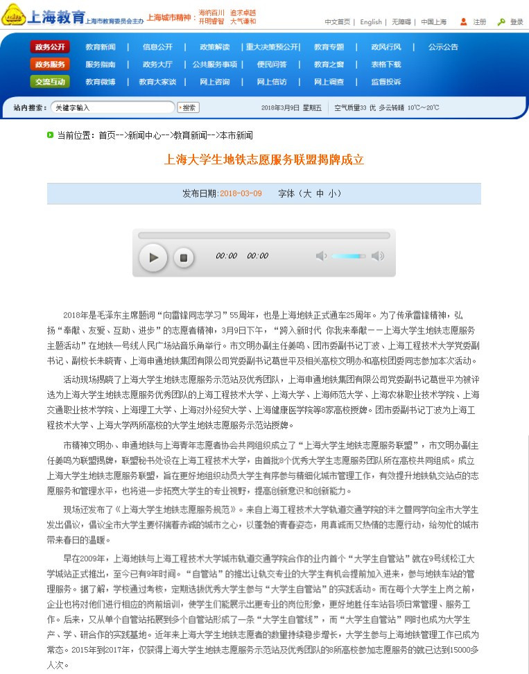 上海教育报道我院成为上海大学生地铁志愿服务联盟成员,全文如下:
