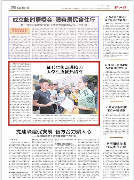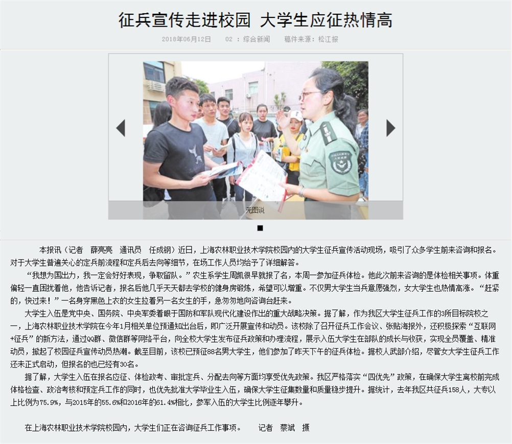 6月12日,松江报第二版报道我院大学生征兵宣传活动现场。