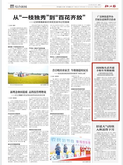 9月26日,松江报第二版报道学院实训基地以“田间地头话共建,丰收年里教稼穑”为主题举办首届“农民丰收节”活动。