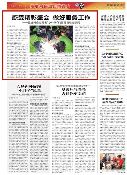11月8日,松江报第三版报道学院43名轨道交通志愿者场外服务进博会。