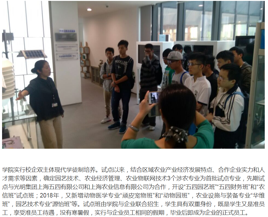 学院实行校企双主体现代学徒制培养。试点以来,结合区域农业产业经济发展特点、合作企业实力和人才需求等因素,确定园艺技术、农业经济管理、农业物联网技术3个涉农专业为首批试点专业,先期试点与光明集团上海五四有限公司和上海农业信息有限公司为合作,开设“五四园艺班”“五四财务班”和“农信班”试点班;2018年,又新增动物医学专业“顽皮宠物班”和“动物园班”,农业设施与装备专业“华维班”,园艺技术专业“源怡班”等。试点班由学院与企业联合招生,学生具有双重身份,既是学生又是准员工,享受准员工待遇,没有寒暑假,实行与企业员工相同的假期,毕业后即成为企业的正式员工。