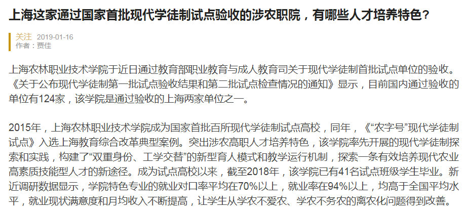 2015年,上海农林职业技术学院成为国家首批百所现代学徒制试点高校,同年,《“农字号”现代学徒制试点》入选上海教育综合改革典型案例。突出涉农高职人才培养特色,该学院率先开展的现代学徒制探索和实践,构建了“双重身份、工学交替”的新型育人模式和教学运行机制,探索一条有效培养现代农业高素质技能型人才的新途径。成为试点高校以来,截至2018年,该学院已有41名试点班级学生毕业。新近调研数据显示,学院特色专业的就业对口率平均在70%以上,就业率在94%以上,均高于全国平均水平,就业现状满意度和月均收入不断提高,让学生从学农不爱农、学农不务农的离农化问题得到改善。