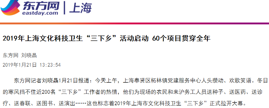 1月21日,东方网报道我院参加2019年上海市科技文化卫生“三下乡”活动启动仪式,并提供相应服务。