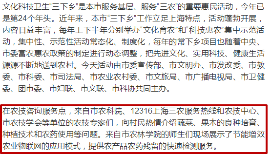 在农技咨询服务点,来自市农科院、12316上海三农服务热线和农技中心、市农技学会等单位的农技专家们,向村民热情介绍蔬菜、果木的良种培育、种植技术和农药使用等问题。来自市农林学院的师生们现场展示了节能增效农业物联网的应用模式,提供农产品农药残留的快速检测服务。