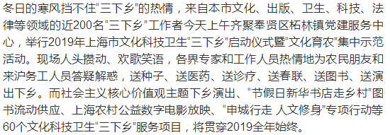 冬日的寒风挡不住“三下乡”的热情,来自本市文化、出版、卫生、科技、法律等领域的近200名“三下乡”工作者今天上午齐聚奉贤区柘林镇党建服务中心,举行2019年上海市文化科技卫生“三下乡”启动仪式暨“文化育农”集中示范活动。现场人头攒动、欢歌笑语,各界专家和工作人员热情地为农民朋友和来沪务工人员答疑解惑,送种子、送医药、送诊疗、送春联、送图书、送演出下乡。而社会主义核心价值观主题下乡演出、“节假日新华书店走乡村”图书流动供应、上海农村公益数字电影放映、“申城行走 人文修身”专项行动等60个文化科技卫生“三下乡”服务项目,将贯穿2019全年始终。
