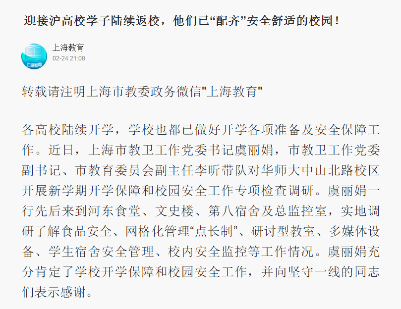 2月24日,上海教育报道上海高校开学准备及安全保障工作,我院在报道之列。