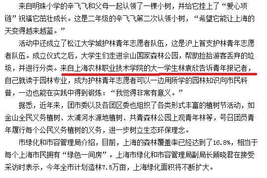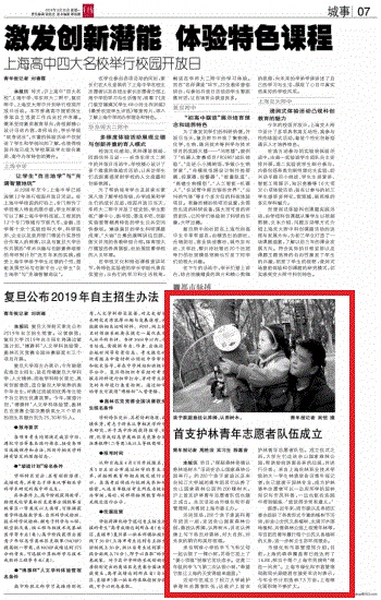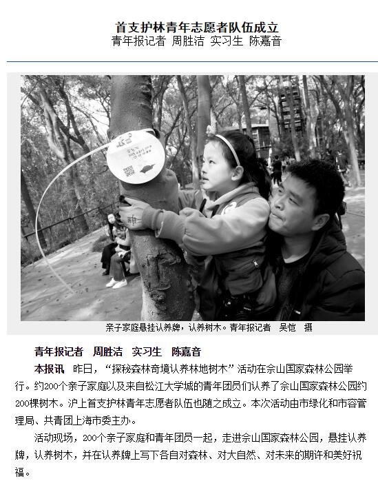 3月25日,青年报报道我院护林青年志愿者队伍志愿服务佘山国家森林公园“探秘森林奇境认养林地树木”活动。