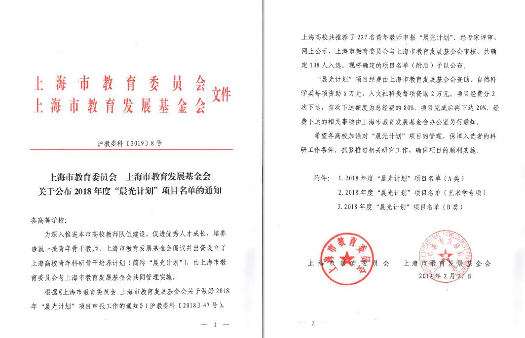 据悉,2018年上海各高校共推荐了227名青年教师申报“晨光计划”。经专家评审、网上公示、上海市教育委员会和上海市教育发展基金会审核,共确定108人入选。截止目前,学院已有16项“晨光计划”项目。