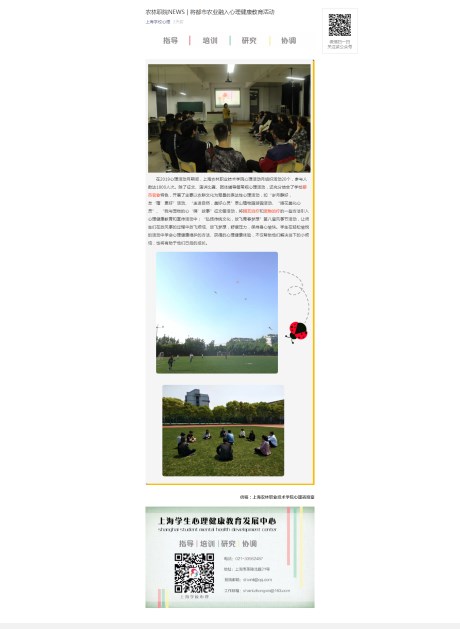 5月14日,上海学校心理报道我院将都市农业融入心理健康教育活动,全文报道如下:在2019心理活动月期间,上海农林职业技术学院心理活动月组织活动20个,参与人数达1800人次。除了征文、演讲比赛、团体辅导等常规心理活动,还充分结合了学校都市农业特色,开展了主要以农耕文化为背景的表达性心理活动,如“岁月静好,友‘植’更好”活动、“走进自然,美好心灵”辰山植物园游园活动、“插花美化心灵”、“我与宠物的心‘晴’故事”征文等活动,将园艺治疗和宠物治疗的一些方法引入心理健康教育和宣传活动中;“弘扬传统文化,放飞青春梦想”第八届风筝节活动,让师生们在放风筝的过程中放飞烦恼、放飞梦想,舒缓压力,保持身心愉快。学生在轻松愉悦的活动中学会心理健康维护的方法、获得的心理健康体验,不仅帮助他们解决当下的小烦恼,也将有助于他们日后的成长。