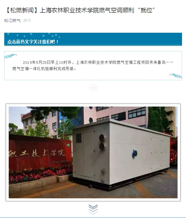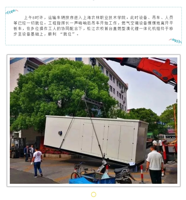 2019年5月25日早上10时许,上海农林职业技术学院燃气空调工程项目传来喜讯——燃气空调一体化机组顺利完成吊装。
