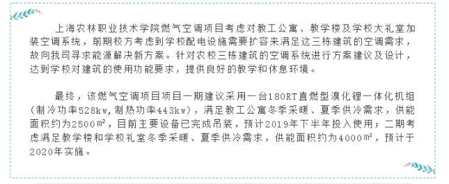 上海农林职业技术学院燃气空调项目考虑对教工公寓、教学楼及学校大礼堂加装空调系统,前期校方考虑到学校配电设施需要扩容来满足这三栋建筑的空调需求,故向我司寻求能源解决新方案。针对农校三栋建筑的空调系统进行方案建议及设计,达到学校对建筑的使用功能要求,提供良好的教学和休息环境。