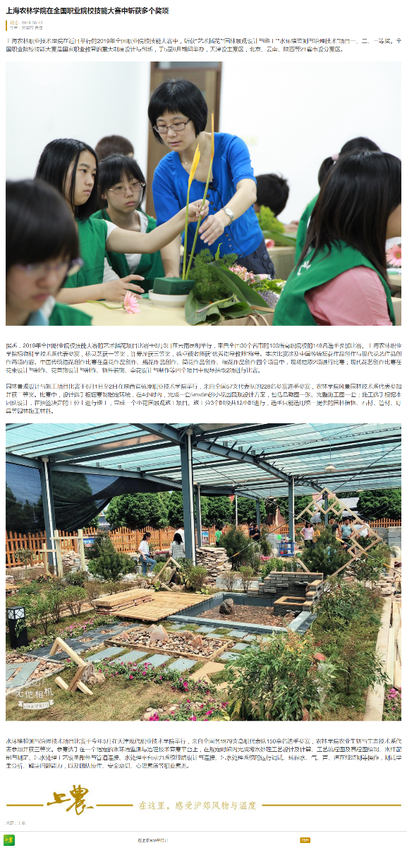 上海农林职业技术学院在近日举行的2019年全国职业院校技能大赛中,斩获“艺术插花”“园林景观设计与施工”“水环境监测与治理技术”项目一、二、三等奖。全国职业院校技能大赛是国家职业教育的重大制度设计与创新,于5至6月期间举办,天津设主赛区,北京、云南、陕西等21省市设分赛区。