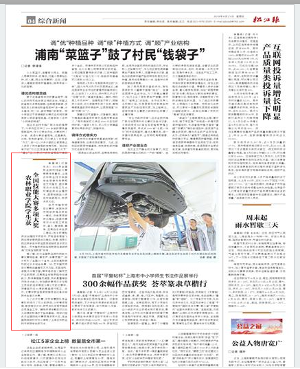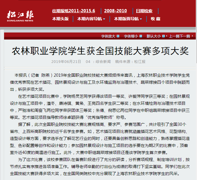 6月21日,松江报报道我院学生获全国技能大赛多项大奖。