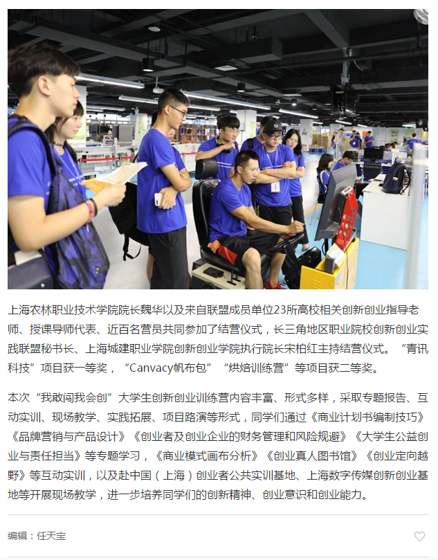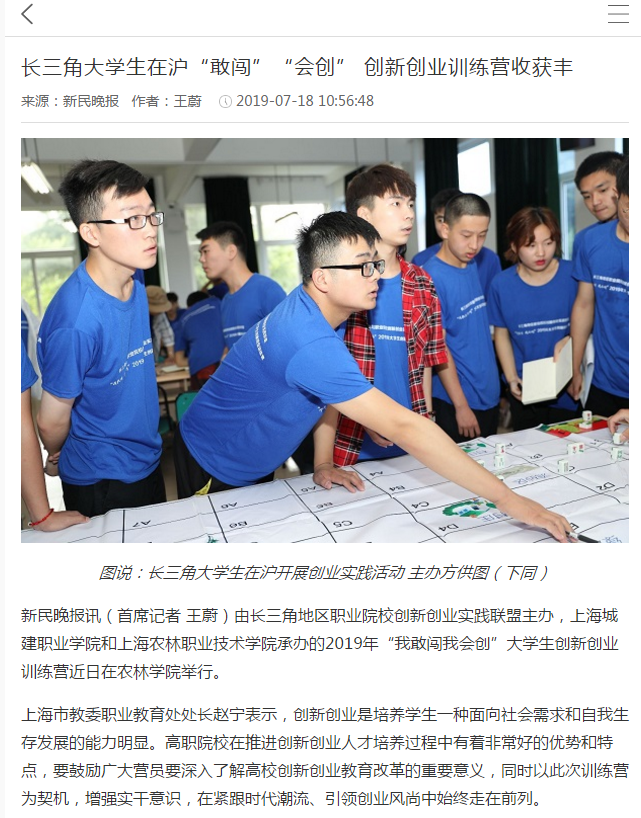 7月18日,新民晚报报道大学生在我院承办的长三角地区职业院校大学生创新创业训练营中收获颇多。
