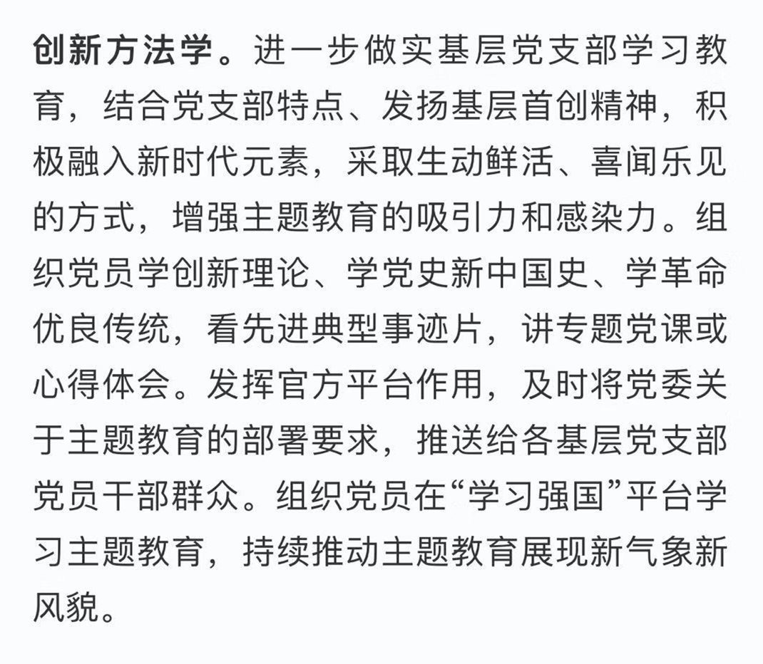 创新方法学。进一步做实基层党支部学习教育,结合党支部特点、发扬基层首创精神,积极融入新时代元素,采取生动鲜活、喜闻乐见的方式,增强主题教育的吸引力和感染力。组织党员学创新理论、学党史新中国史、学革命优良传统,看先进典型事迹片,讲专题党课或心得体会。发挥官方平台作用,及时将党委关于主题教育的部署要求,推送给各基层党支部党员干部群众。组织党员在“学习强国”平台学习主题教育,持续推动主题教育展现新气象新风貌。