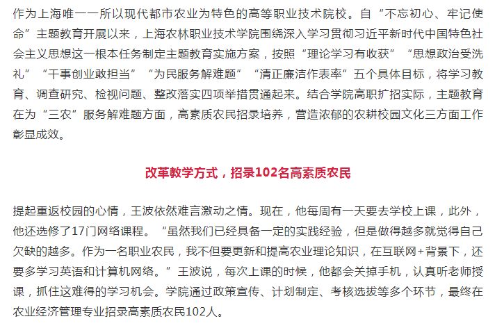 作为上海唯一一所以现代都市农业为特色的高等职业技术院校。自“不忘初心、牢记使命”主题教育开展以来,上海农林职业技术学院围绕深入学习贯彻习近平新时代中国特色社会主义思想这一根本任务制定主题教育实施方案,按照“理论学习有收获”“思想政治受洗礼”“干事创业敢担当”“为民服务解难题”“清正廉洁作表率”五个具体目标,将学习教育、调查研究、检视问题、整改落实四项举措贯通起来。结合学院高职扩招实际,主题教育在为“三农”服务解难题方面,高素质农民招录培养,营造浓郁的农耕校园文化三方面工作彰显成效。