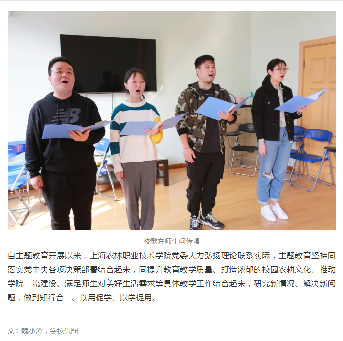 自主题教育开展以来,上海农林职业技术学院党委大力弘扬理论联系实际,主题教育坚持同落实党中央各项决策部署结合起来,同提升教育教学质量、打造浓郁的校园农耕文化、推动学院一流建设、满足师生对美好生活需求等具体教学工作结合起来,研究新情况、解决新问题,做到知行合一、以用促学、以学促用。