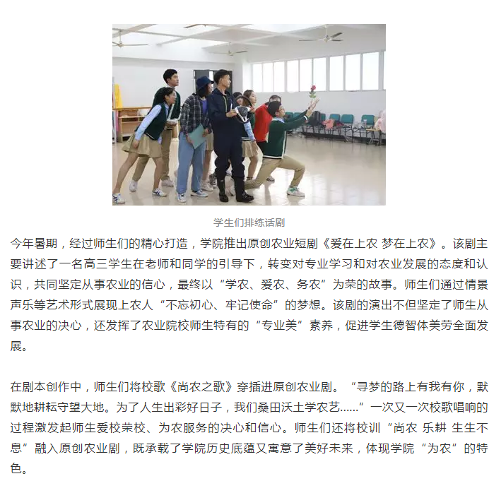 在剧本创作中,师生们将校歌《尚农之歌》穿插进原创农业剧。“寻梦的路上有我有你,默默地耕耘守望大地。为了人生出彩好日子,我们桑田沃土学农艺......”一次又一次校歌唱响的过程激发起师生爱校荣校、为农服务的决心和信心。师生们还将校训“尚农 乐耕 生生不息”融入原创农业剧,既承载了学院历史底蕴又寓意了美好未来,体现学院“为农”的特色。