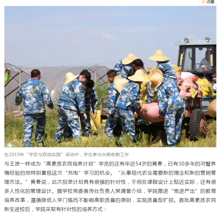 与王波一样成为“高素质农民培养计划”学员的还有年近54岁的黄春,已有30多年的河蟹养殖经验的他特别重视这次“充电”学习的机会。“从事现代农业需要新的理念和新的营销管理方法。”黄春说,此次招录计划具有很强的针对性,不但在课程设计上贴近实际,还有很多人性化的管理设计。据学校党委宣传处负责人樊清誉介绍,学院推进“宽进严出”的教育培养改革,遵循降低入学门槛而不影响高职质量的原则,实现质量型扩招。首批高素质农民新生进校后,学院采取有针对性的培养方式: