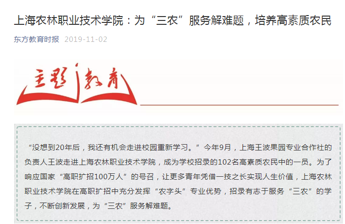 11月2日,东方教育时报报道学院结合高职扩招实际,主题教育在为“三农”服务解难题方面,高素质农民招录培养,营造浓郁的农耕校园文化等方面彰显成效。