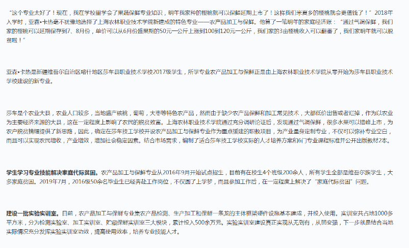 亚森•卡热是新疆维吾尔自治区喀什地区莎车县职业技术学校2017级学生,所学专业农产品加工与保鲜正是由上海农林职业技术学院从零开始为莎车县职业技术学校建设的新专业。