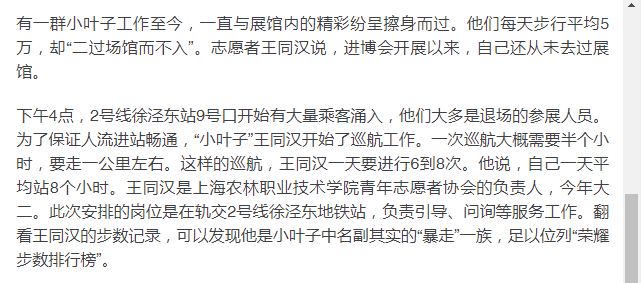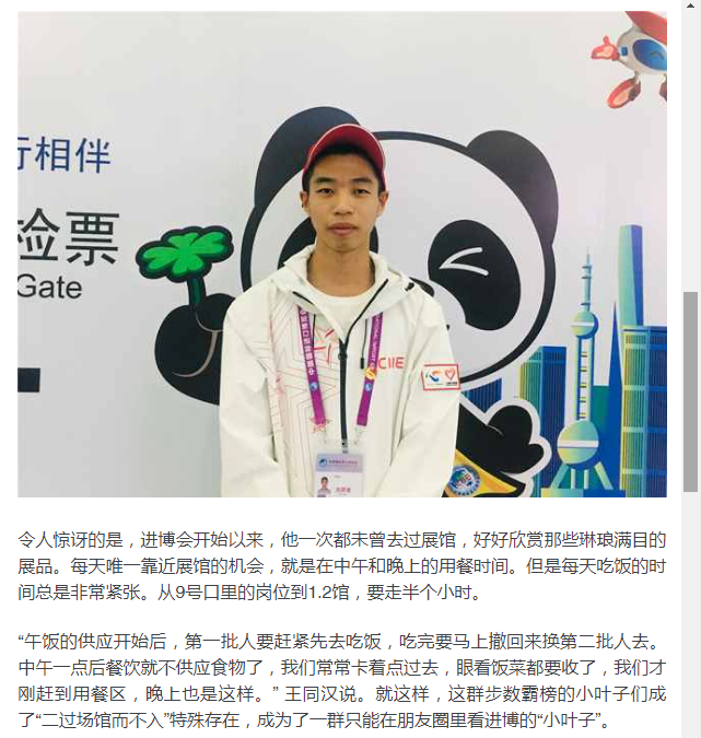 “午饭的供应开始后,第一批人要赶紧先去吃饭,吃完要马上撤回来换第二批人去。中午一点后餐饮就不供应食物了,我们常常卡着点过去,眼看饭菜都要收了,我们才刚赶到用餐区,晚上也是这样。” 王同汉说。就这样,这群步数霸榜的小叶子们成了“二过场馆而不入”特殊存在,成为了一群只能在朋友圈里看进博的“小叶子”。