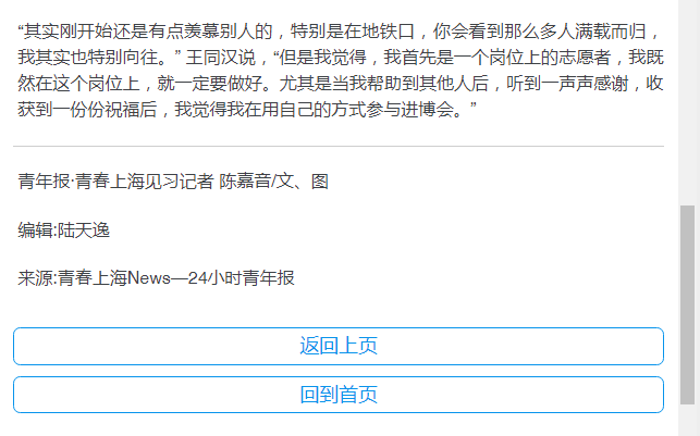 “其实刚开始还是有点羡慕别人的,特别是在地铁口,你会看到那么多人满载而归,我其实也特别向往。” 王同汉说,“但是我觉得,我首先是一个岗位上的志愿者,我既然在这个岗位上,就一定要做好。尤其是当我帮助到其他人后,听到一声声感谢,收获到一份份祝福后,我觉得我在用自己的方式参与进博会。”