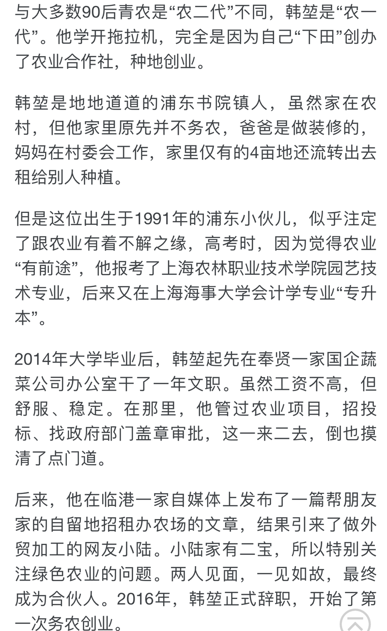 2014年大学毕业后,韩堃起先在奉贤一家国企蔬菜公司办公室干了一年文职。虽然工资不高,但舒服、稳定。在那里,他管过农业项目,招投标、找政府部门盖章审批,这一来二去,倒也摸清了点门道。