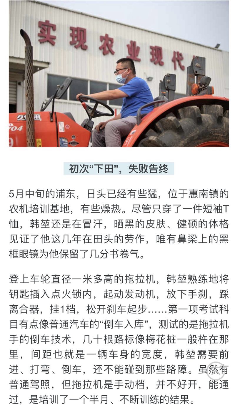 5月中旬的浦东,日头已经有些猛,位于惠南镇的农机培训基地,有些燥热。尽管只穿了一件短袖T恤,韩堃还是在冒汗,晒黑的皮肤、健硕的体格见证了他这几年在田头的劳作,唯有鼻梁上的黑框眼镜为他保留了几分书卷气。