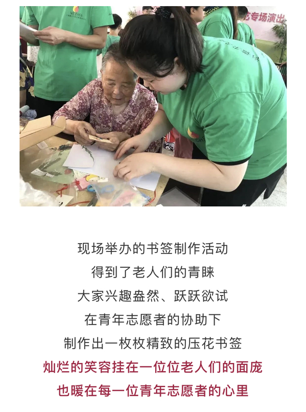 夏日炎炎,上海青年志愿者们热情不减,一场场温馨的为老志愿服务活动持续开展,8月上旬,上海农林职业技术学院园林系7名师生志愿者前往浦东新区汇亲园养护院,开展青年为老志愿服务。志愿者为长者们精心准备了一个温暖的集体生日会,志愿者们为寿星们送上生日蛋糕、唱起生日歌,全场长者们一个个都乐开了花。生日会后,志愿者们还为活动不便的老人剪指甲,陪老人们聊天、倾听他们的故事。同时,现场举办的书签制作活动得到了老人们的青睐,大家兴趣盎然、跃跃欲试,在志愿者的协助下,制作出一枚枚精致的压花书签,灿烂的笑容挂在一位位长者的面庞,也暖在每一位志愿者的心里。