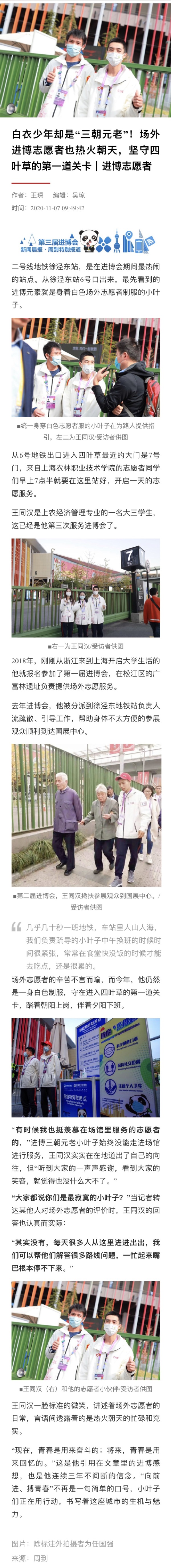 “现在,青春是用来奋斗的;将来,青春是用来回忆的。”这是他引用在文章里的进博感想,也是他连续三年不间断的信念。“向前进、搏青春”不再是一句简单的口号,小叶子们正在用行动,书写着这座城市的生机与魅力。