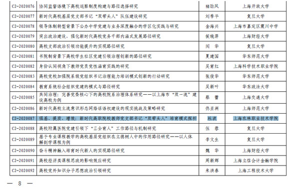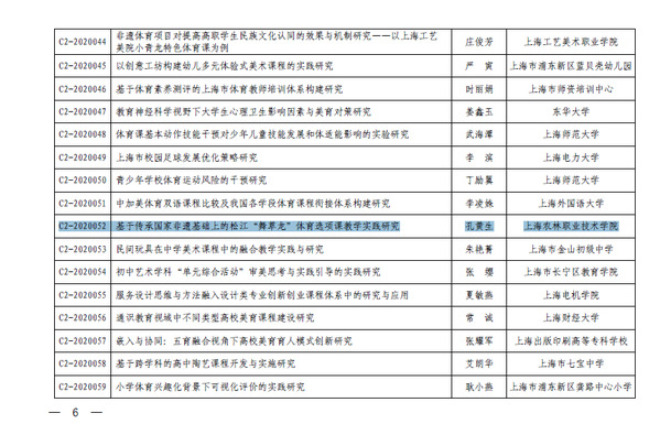 近日,上海市教育委员会公布了2020年度上海市教育科学研究项目(第二批)立项名单,我院有2项获得一般项目立项,分别是组织处杜波老师申报的题为《强基、提质、增效:新时代高职院校教师党支部书记“双带头人”培育模式探析》的“教育基本理论(党建类)”项目;基础部孔黄生老师申报的题为《基于传承国家非遗基础上的松江“舞草龙”体育选项课教学实践研究》的“体育卫生美育”学科项目。项目研究周期为三年,资助经费均为5万元。