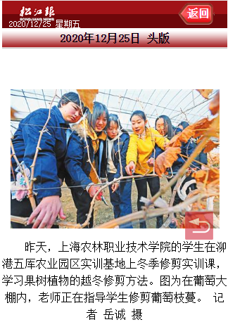 12月25日,松江报头版图片新闻报道我院学生在实训基地上冬季修剪实训课。全文如下: