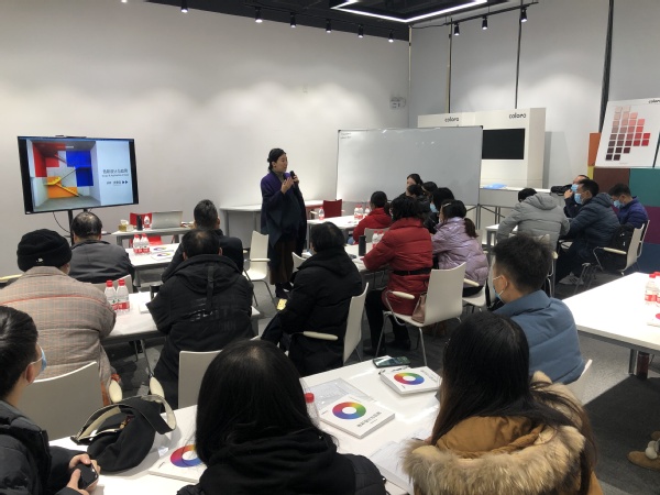 1月13日英国南安普顿大学国际服装设计学院企业导师、法国趋势研究机构NellyRodi中国区流行趋势解读顾问史春佳老师为学员们开设专题讲座《色彩与文化》与《用色彩讲故事》。史老师通过解析品牌的颜色与识别、赏析品牌颜色文化到世界颜色文化、分享“颜色的故事”等专业知识的讲授,以及开展应用九大色调训练工具,制作主题情绪展板的实践操作,让学员们以理论与实践相结合的方式体验色彩给生活、工作带来影响及魅力。