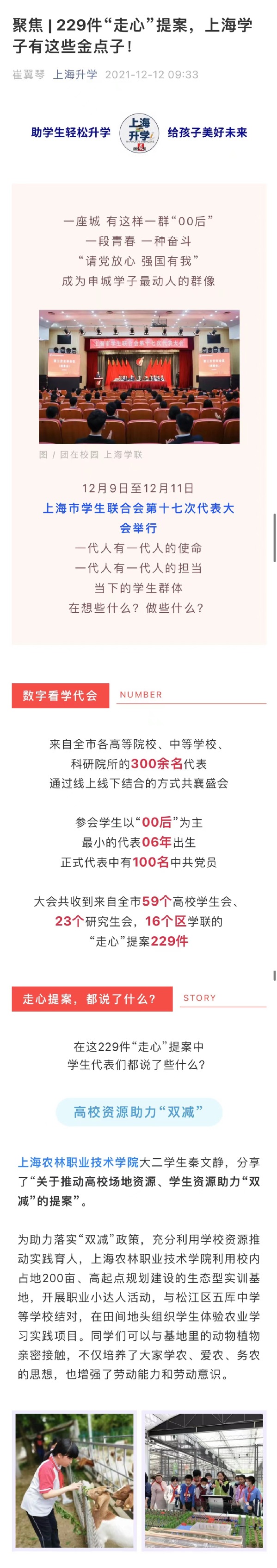 12月12日,“上海升学”公众号(《新闻晨报》教育公众微信平台)报道了学院上海市第十七次学代会学生提案。报道全文如下: