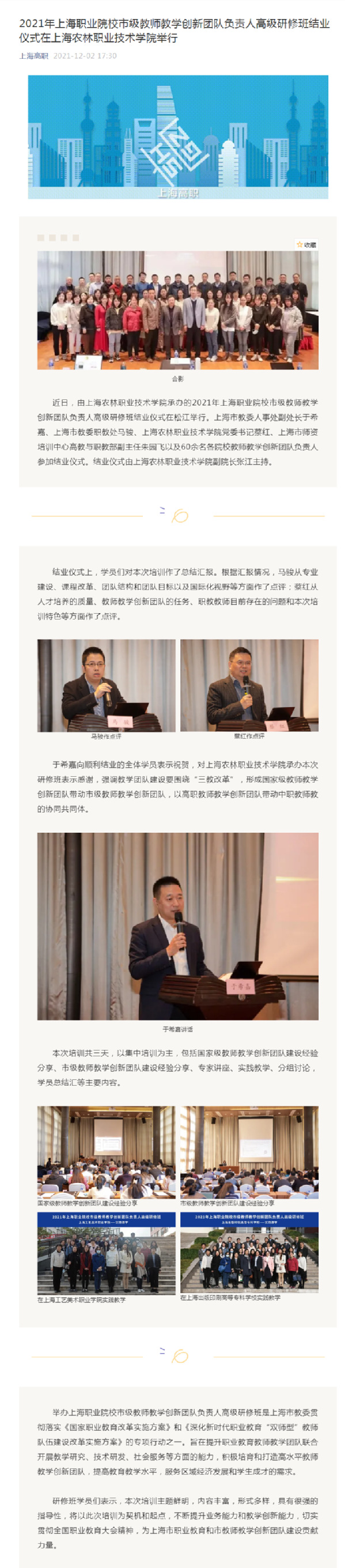 12月2日,“上海高职”微信公众号报道学院承办2021年上海职业院校市级教师教学创新团队负责人高级研修班,全文如下:
