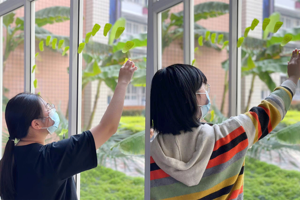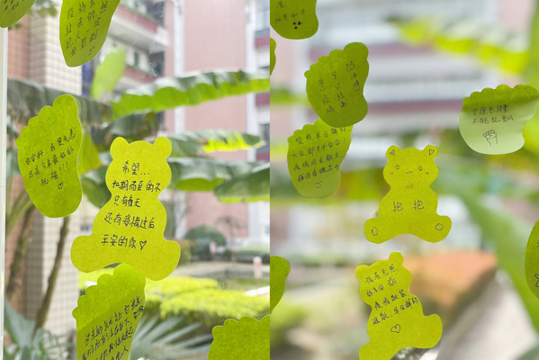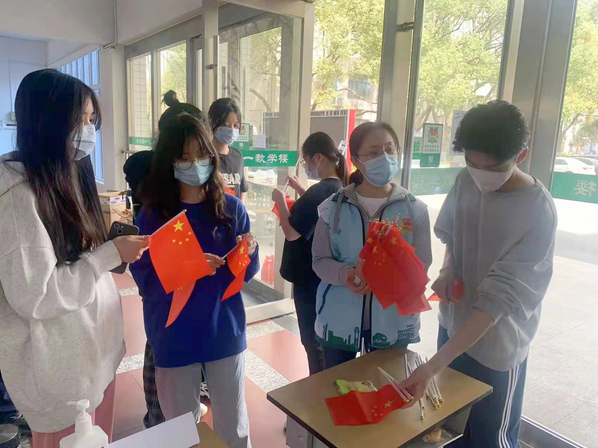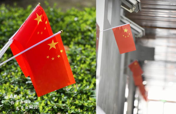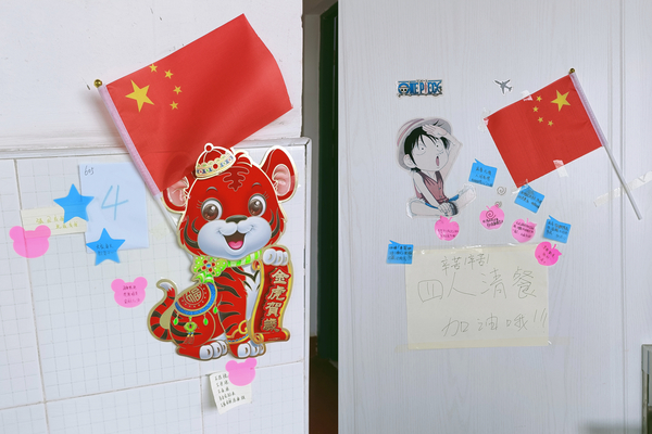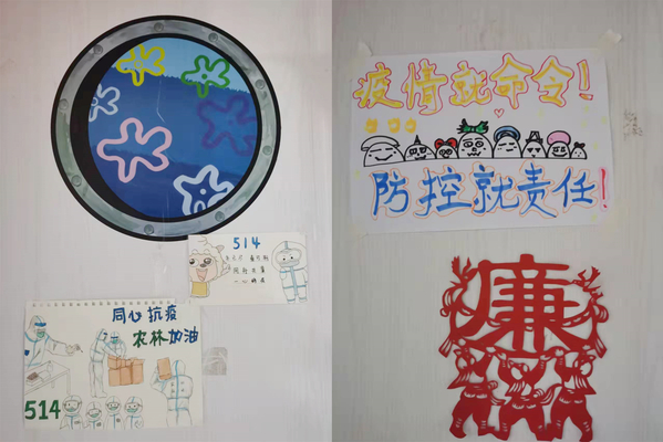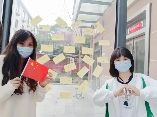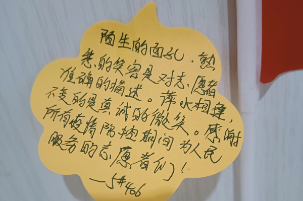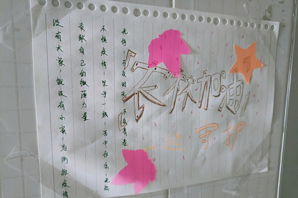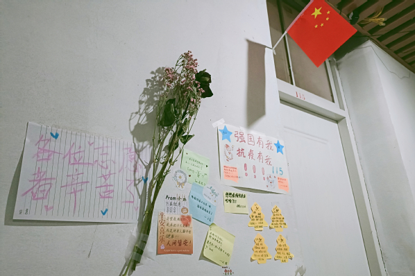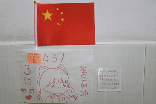同学们响应热烈,纷纷认领国旗、便利贴纸,在宿舍门前悬挂起国旗,将心中的感激书写张贴在门上。宿舍楼道内,一面面红旗迎风飘扬,彰显最美“中国红”,宣示着防“疫”必胜的决心。房门上,一段段文字温暖人心,记录着最真诚的感激,寄托着最美好的祝福。