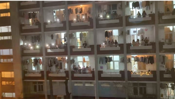学生安稳了,开心了。在宿舍区组织的拉歌活动,学生们打开手机闪光灯,唱着欢乐地歌曲。那一束束光线犹如闪耀的星星,在窗口、阳台上闪烁,听着欢快的歌声,学生工作者们露出了欣慰的笑颜。