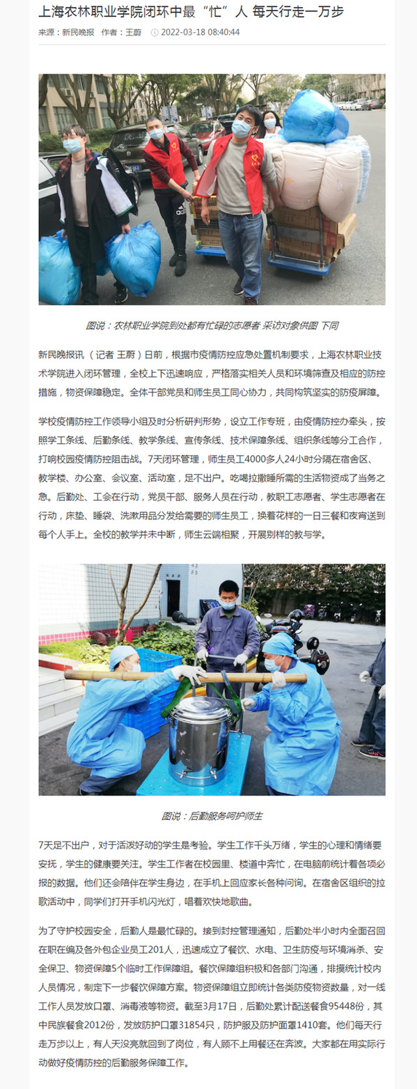 日前,根据市疫情防控应急处置机制要求,上海农林职业技术学院进入闭环管理,全校上下迅速响应,严格落实相关人员和环境筛查及相应的防控措施,物资保障稳定。全体干部党员和师生员工同心协力,共同构筑坚实的防疫屏障。