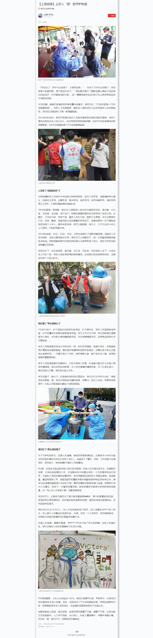 “7天过去了,终于可以回家了,大家再见啦。”“太好了,今天可以回家了,明天我家小区要封控,再不走回不去了。”综合教学楼十二楼的走廊上响起了此起彼伏的告别声,行李箱拖动的声音……这一幕幕场景发生在3月17日上海农林职业技术学院校园里。