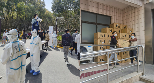 “同学你多穿点衣服,外面天气变冷了。”在一教值守的经管系辅导员张婧敏,一边给外出活动的同学测温登记,一边说道。安排好学生的日常生活只是她工作的一部分,与同事们并肩携手投入防疫工作是当前时段的重点工作。同样,在一教值守的还有经管系辅导员唐晓英。两人一直坚守岗位,连日来扮演了不同的“角色”。一日三餐时,她们是为学生送餐的“派送员”;物资来了,推上小推车就是搬运物资的“搬货员”;穿上志愿者马甲服,立马化身为随时待命的疫情防控“志愿者”。