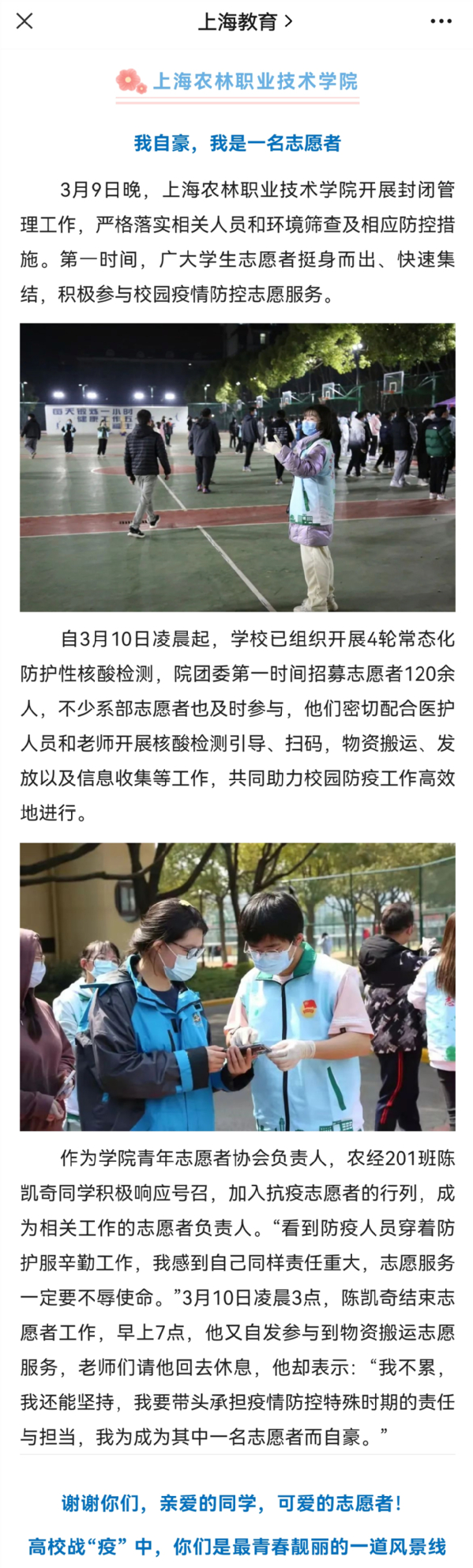 3月9日晚,上海农林职业技术学院开展封闭管理工作,严格落实相关人员和环境筛查及相应防控措施。第一时间,广大学生志愿者挺身而出、快速集结,积极参与校园疫情防控志愿服务。