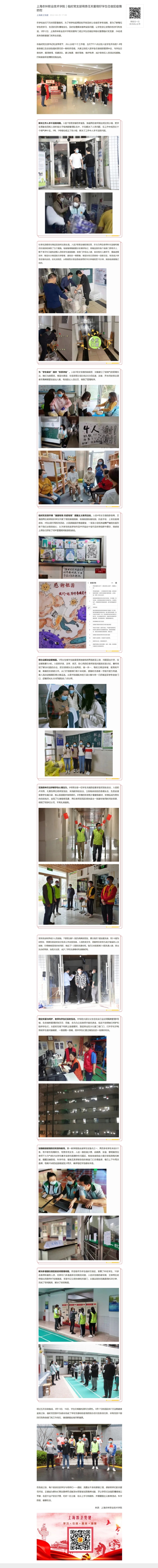 4月5日,“上海教卫党委”微信公众号报道学院学生住宿区网格化管理临时党支部,用责任关爱做好学生住宿区疫情防控。
