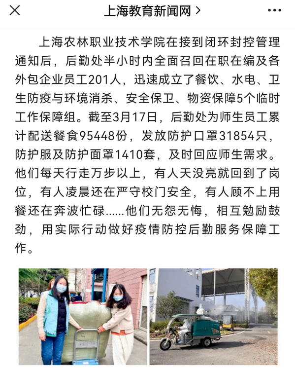 上海农林职业技术学院在接到闭环封控管理通知后,后勤处半小时内全面召回在职在编及各外包企业员工201人,迅速成立了餐饮、水电、卫生防疫与环境消杀、安全保卫、物资保障5个临时工作保障组。截至3月17日,后勤处为师生员工累计配送餐食95448份,发放防护口罩31854只,防护服及防护面罩1410套,及时回应师生需求。他们每天行走万步以上,有人天没亮就回到了岗位,有人凌晨还在严守校门安全,有人顾不上用餐还在奔波忙碌......他们无怨无悔,相互勉励鼓劲,用实际行动做好疫情防控后勤服务保障工作。