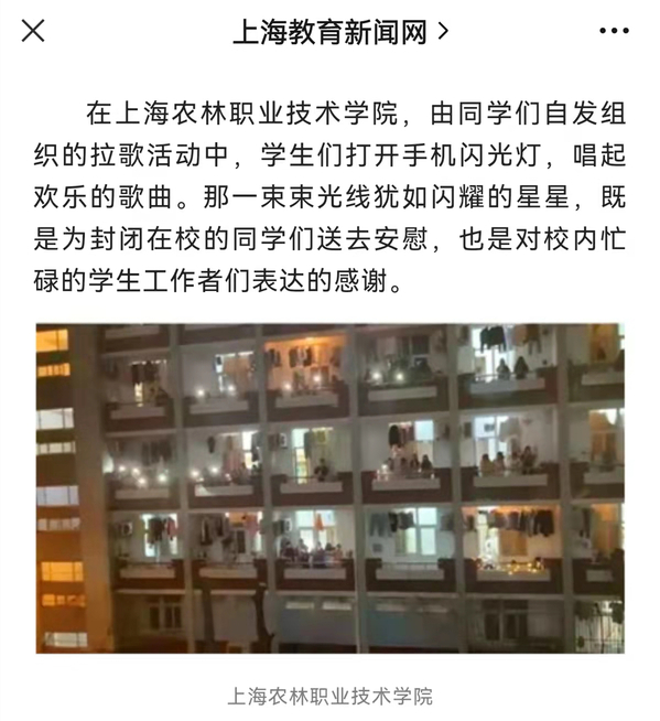 在上海农林职业技术学院,由同学们自发组织的拉歌活动中,学生们打开手机闪光灯,唱起欢乐的歌曲。那一束束光线犹如闪耀的星星,既是为封闭在校的同学们送去安慰,也是对校内忙碌的学生工作者们表达的感谢。