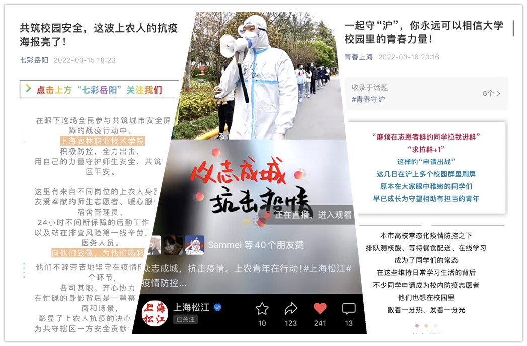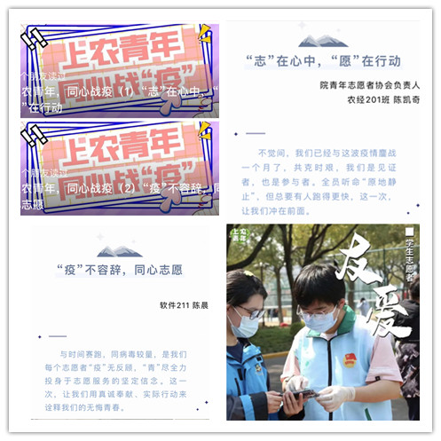党旗所指就是团期所向。院团委积极贯彻落实团市委、学院党委关于疫情防控工作要求和部署,坚定不移地坚持“动态清零”总方针不动摇,将共青团思想育人、实践育人、文化育人、网络育人与服务疫情防控大局结合起来,为坚决打赢疫情防控攻坚战贡献青春力量。“坚持就是胜利,坚持才能胜利。”广大上农青年表示,在上海疫情防控处于全面打响社会面清零攻坚行动的关键时期,用“战疫必胜”的坚定信念和“战疫有我”的实际行动,彰显上农青年风采与担当,让青春在抗疫大局中闪闪发光。
